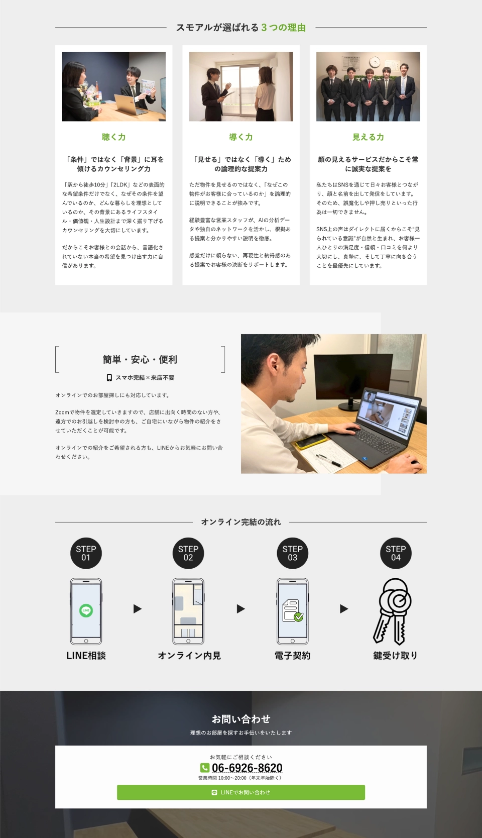 オンライン完結の流れを「LINE相談→オンライン内見→電子契約→鍵受け取り」とアイコンやステップ図で表しました。実際に利用するイメージを直感的に理解できる設計です。