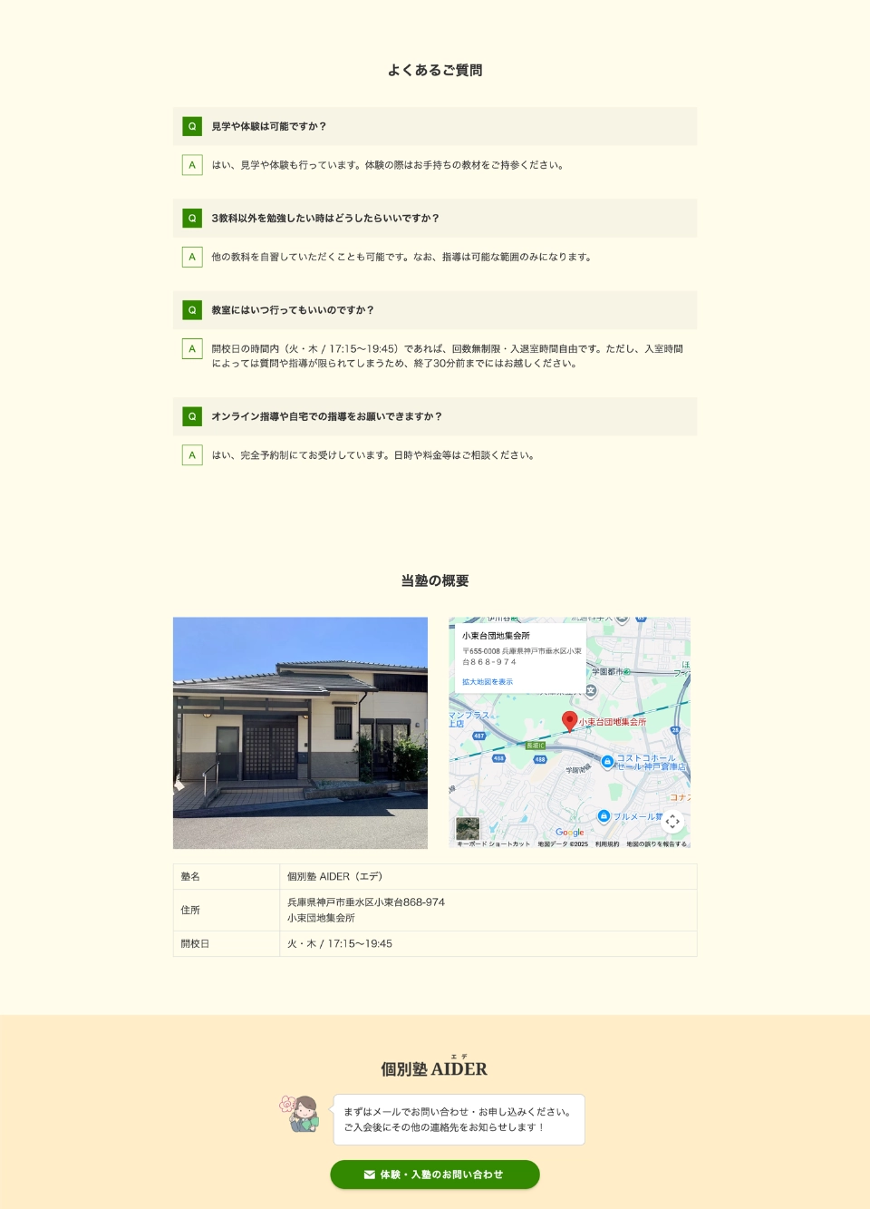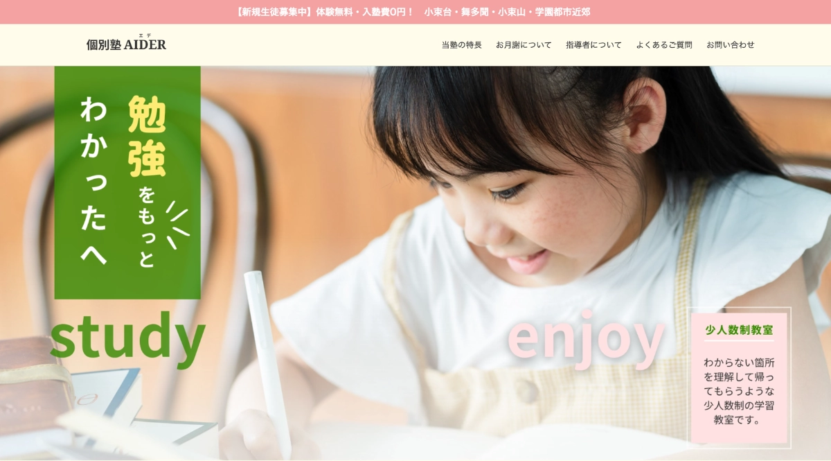 兵庫県神戸市の個別塾「AIDER」様のランディングページを制作しました。チラシのQRコードからアクセスした人向けに塾の概要がスムーズに伝わる構成となっています。