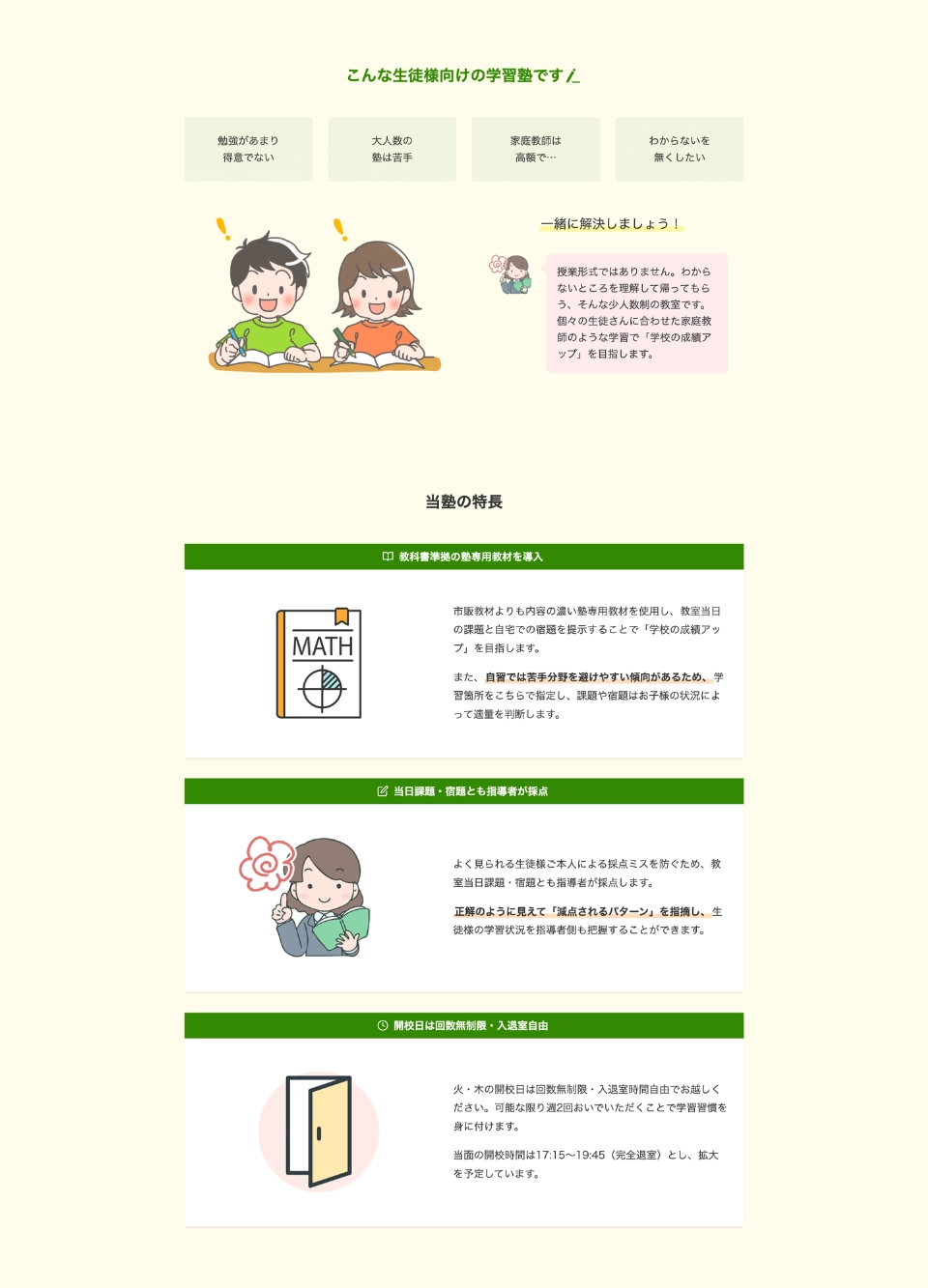 白×青系を基調とした塾のWebサイトが多い中、柔らかい配色と教科書のようにイラストやマーカー線を用いて地域密着型の「通いやすい個別教室」をイメージしました。